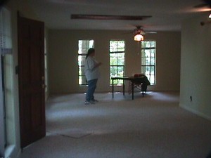 ![]() This is the great room, a whopping 18'x35'. I'm standing next to the wood burning stove. Notice the windows. They start to my left, go around the far wall, and into the bedroom. |