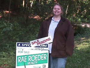 This is Tiffany Standing next to the For Sale sign, with OUR Sale Pending tag already on it. |
